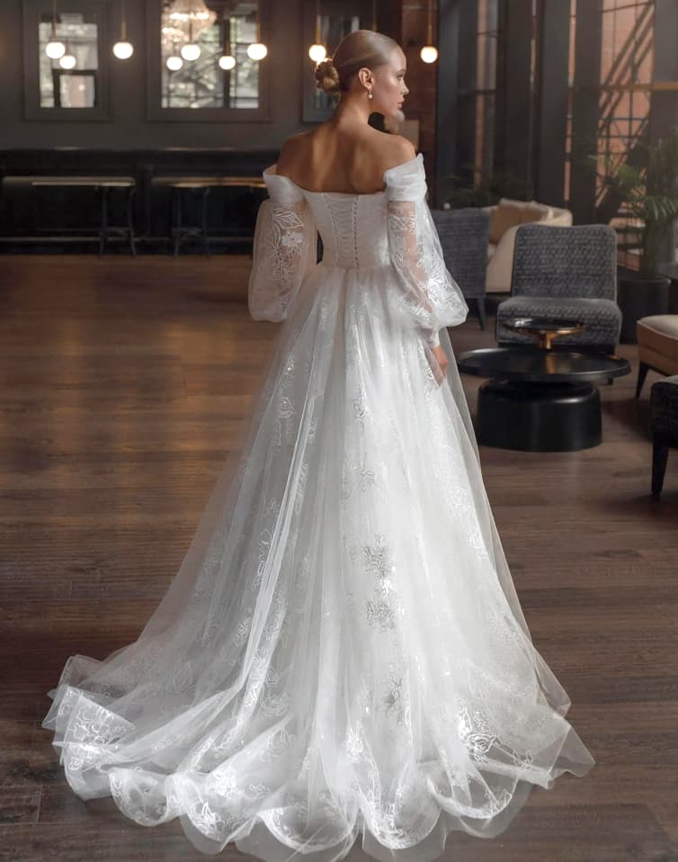 Свадебное платье А-силуэт с рукавами, которые при желании можно снять, невероятно популярно. Рукава делают в виде съемных буфов или фонариков, но также может быть клеш, ниспадающие бретели и т. д. Они присутствуют в разных моделях и нередко становятся главной фишкой образа.