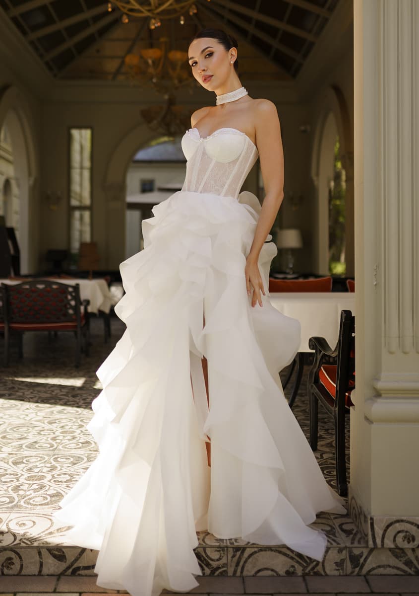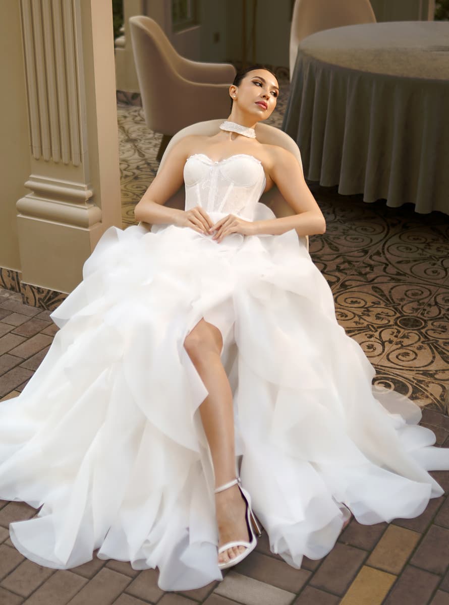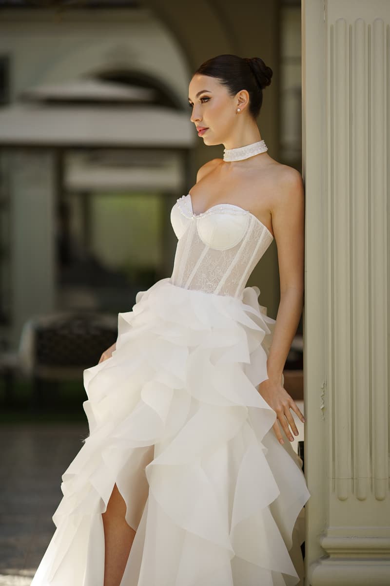 Шикарная новинка сезона! Корсет бюстье украшен кружевом шантильи и жемчужными бусинами. Юба выполнена в дизайнерском исполнении с заманчивым разрезом по ноге. Изюминка в модели-чокер расшитый кружевом.