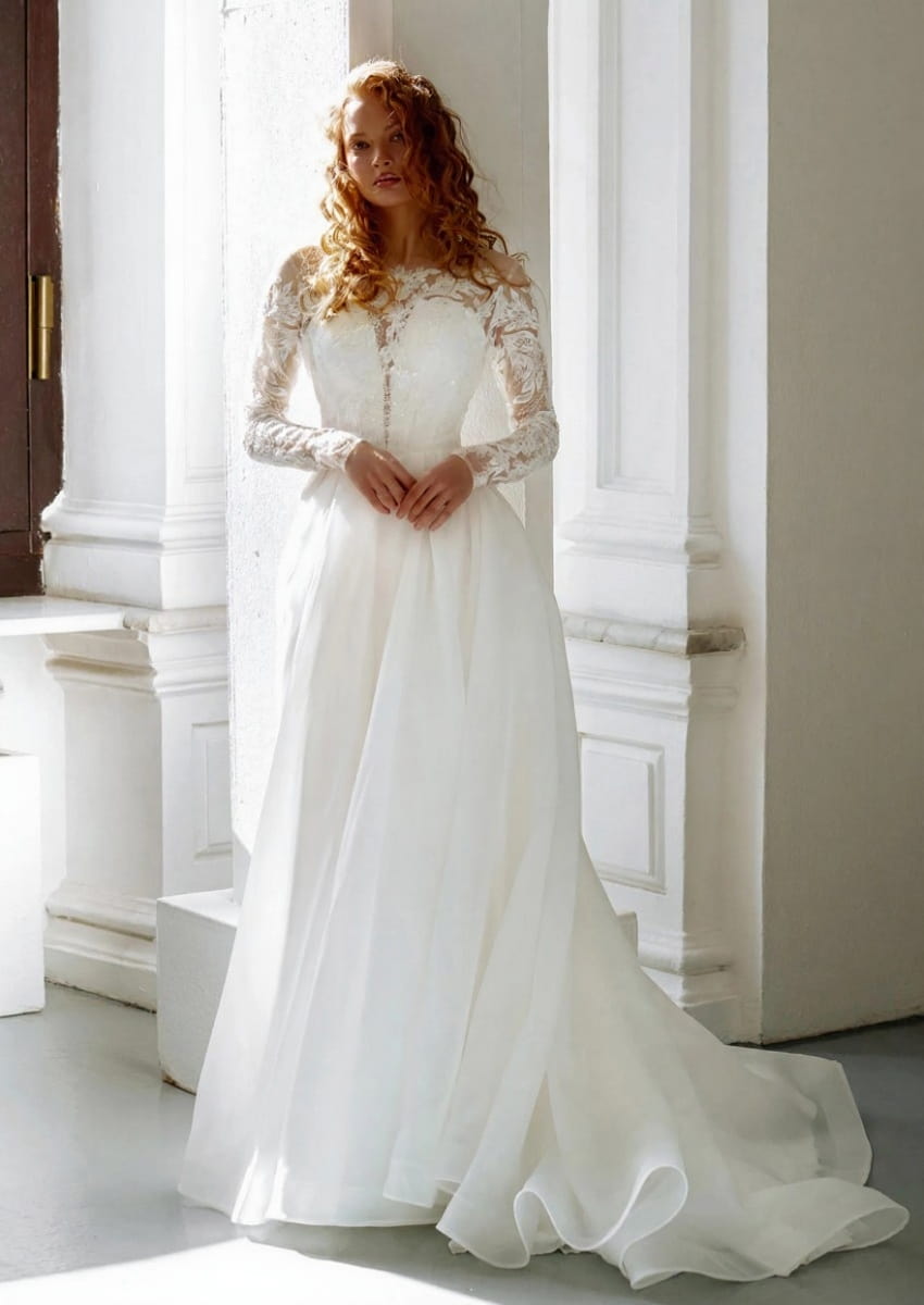 Элегантная классика, с красивым кружевным верхом, с идеальной посадкой корсета и воздушной юбкой из восковой органзы со шлейфом.